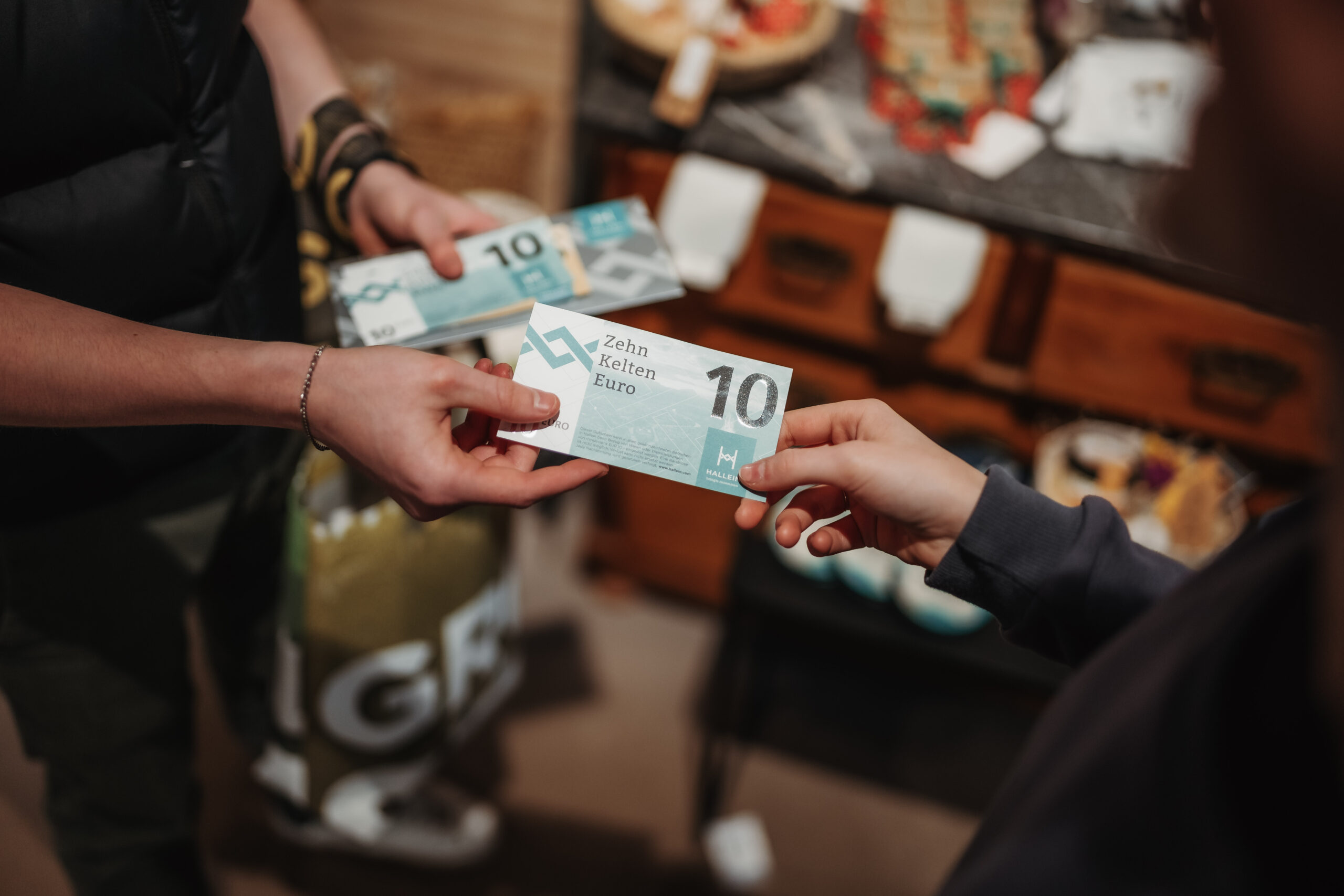 Ein Kelten Euro entspricht dem Wert eines Gutscheins über 10 Euro und kann in vielen Halleiner Geschäften, Gastronomie-, Dienstleistungs- und Gewerbebetrieben eingelöst werden.