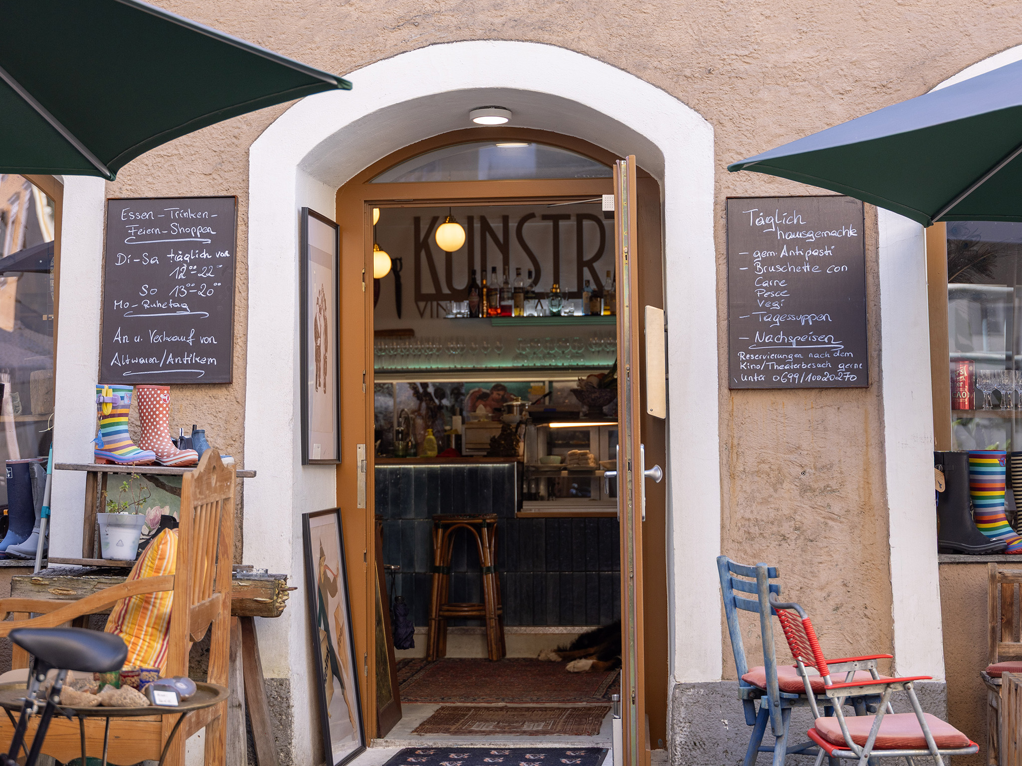 Neben kulinarischen Genüssen gibt es einen einzigartigen Antiquitäten- und Vintage-Shop mit handverlesenen Schätzen vergangener Zeiten. In fantastischer Lage an der Salzachpromenade bietet das Café Blick auf die Halleiner Altstadt und den Dürrnberg. Ob Brunch, Nachmittagskaffee, After-Work-Drink oder geselliger Abend – hier finden Gäste den perfekten Platz. In den wärmeren Monaten lädt die Terrasse zum Genießen des Ausblicks ein.